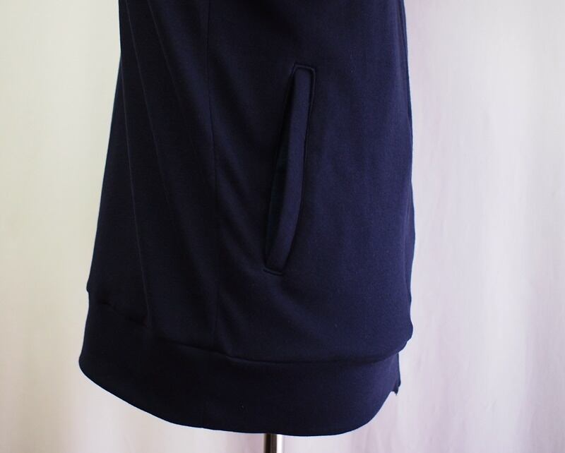 ハンドウォーマーの片玉縁ポケット、袖ぐり、脇の縫い目は端ロック片倒し、肩先から裾へ向かってナチュラルフィットのシルエット