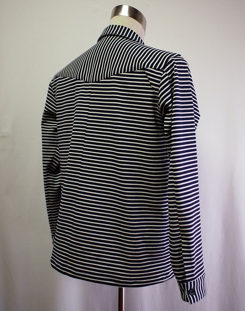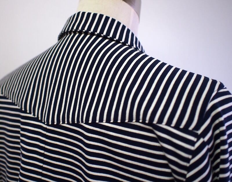 ボーダー柄を縦横に使い分けたウエスタンヨークが際立ち、身幅、袖幅ともに程よいゆとりでスッキリとしたシルエット