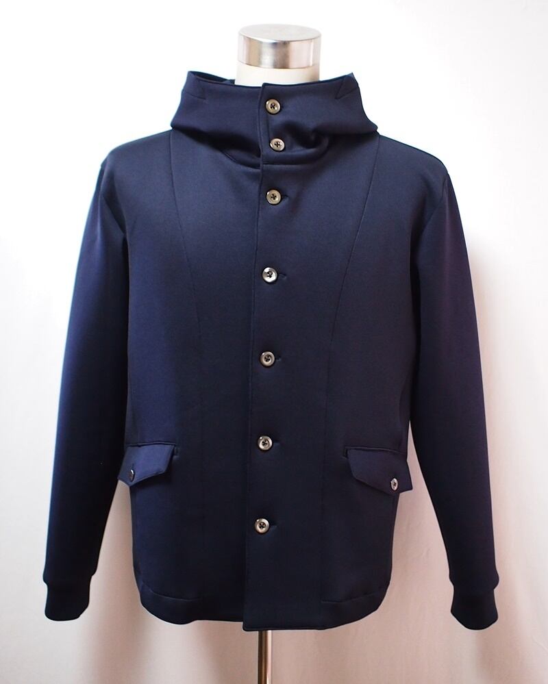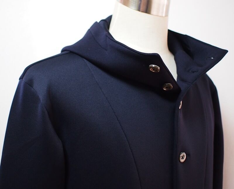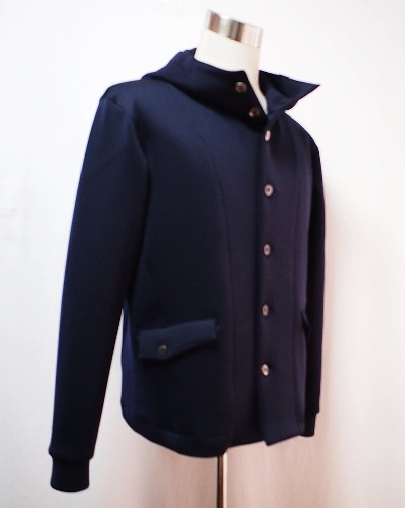 前中心高さ10㎝あるフードで首元から空気を通しにくい防寒性、前中心7つボタン開きでハイネックのフーデッドジャケット