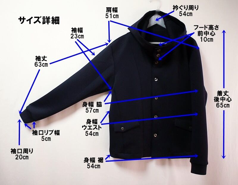着丈65㎝、肩幅51㎝、袖丈63㎝、身幅が脇で57㎝、ウエストから裾は54㎝、少し大き目なLサイズくらいのサイズ感です