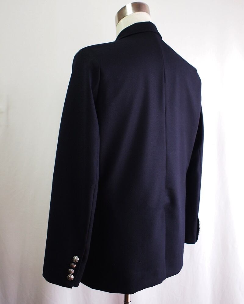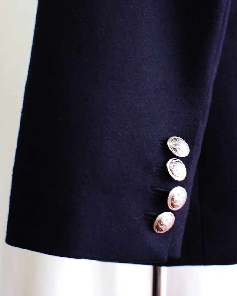 ベーシックなノッチドラペルのテーラードジャケットで前開きボタンは真鍮のいぶし銀ボタン(直径21㎜)でトラッドな段返り3つボタン