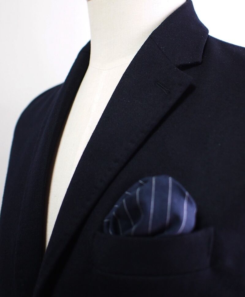 更に綿100%のネイビーベースのストライプ生地を左胸箱ポケット袋布、内ポケット片玉縁へ使用