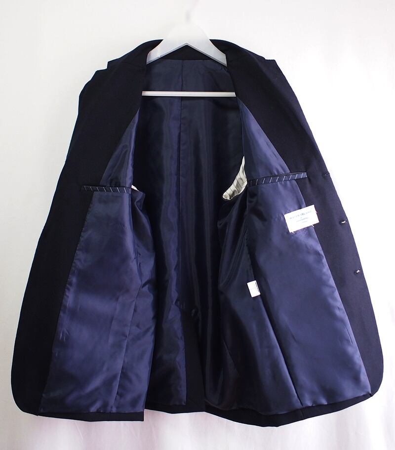総裏仕立ての身頃裏はポリエステル100%でネイビー系、袖裏はキュプラ100%でアイボリーベースのストライプ