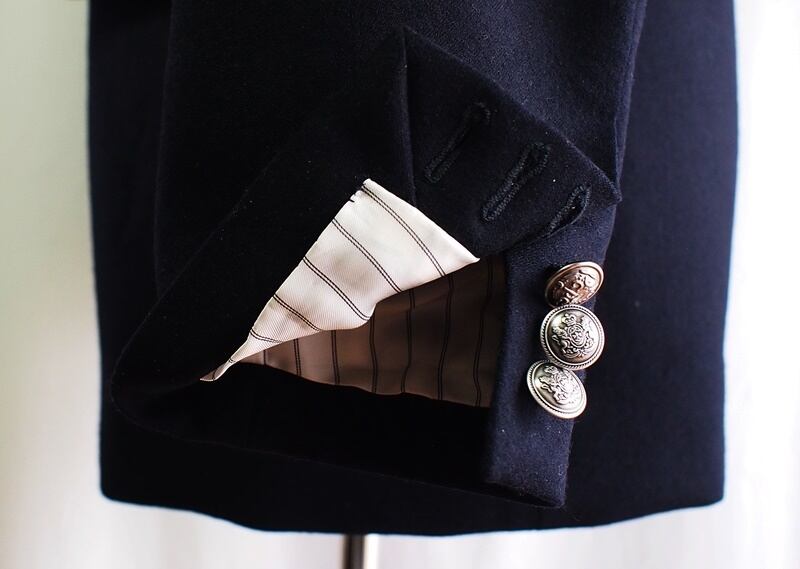 後裾中心にはセンターベント、裾と袖口の始末は二つ折りしてまつり縫い、全くミシンステッチを使わず、少しフォーマルな手縫い仕様