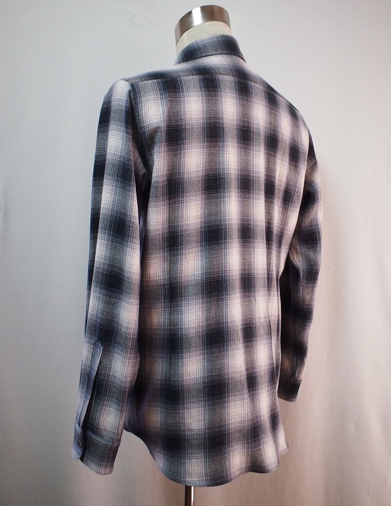 左胸パッチポケットのみバイヤス使い、スッキリした袖幅で袖口ワンタック、ボタンなしの剣ボロ、角を丸くカットしたラウンドカフス