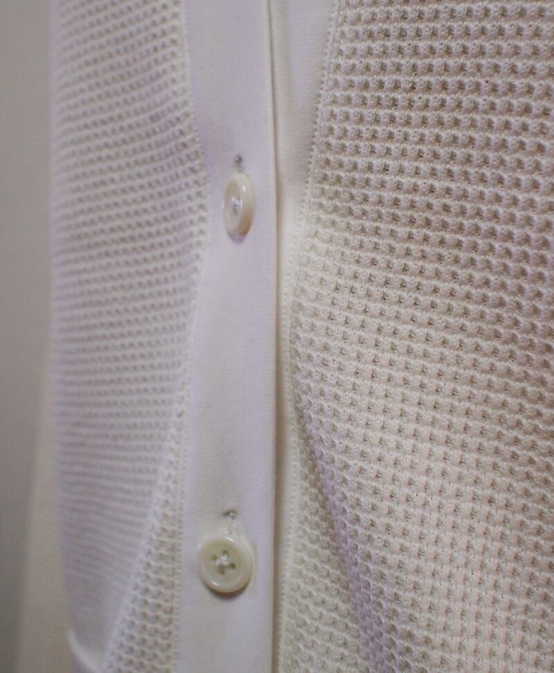 綿100%で白い肉厚なヘヴィーウェイトワッフルをメインに使用、3㎜角くらいの立体的な凹凸感で横方向に強い伸縮性、柔らかな肌触りのジャージー、ニットのような着心地です