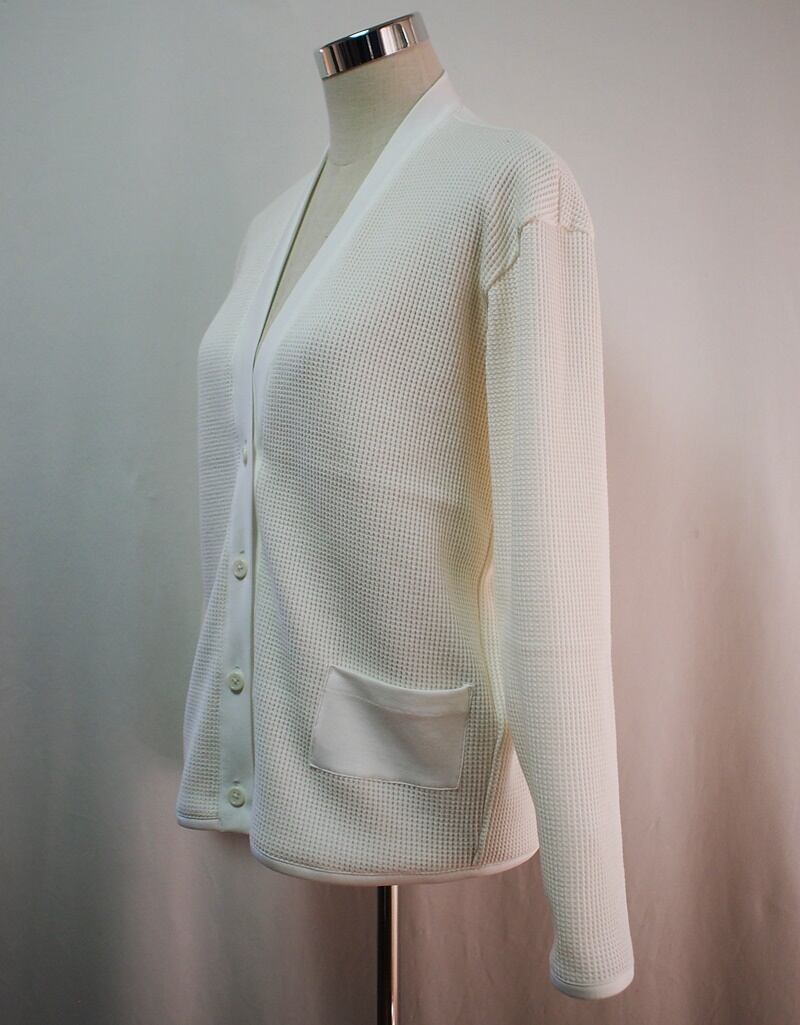 洗濯などのお手入れや取り扱いがしやすく、チクチク感が苦手な方にはとてもおすすめ、気軽なアウターとしても使えそうなヘビーウェイトワッフルのVネックカーディガンです。