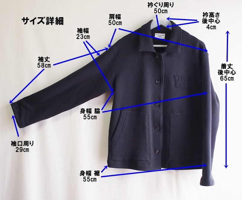 肩幅50㎝、身幅は脇で55㎝、裾で55㎝、袖丈58㎝、着丈65㎝、ゆとり持たせたサイズ感