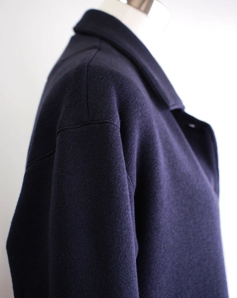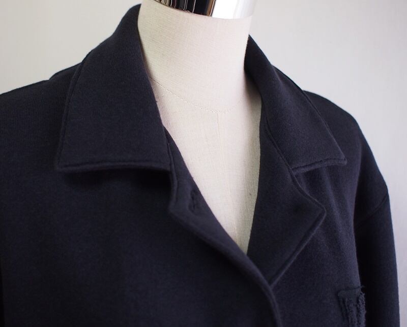 衿は台衿の無いフラットカラー、前開き5つボタンのカバーオールジャケット、ボタンは全てネイビー系マーブルのスコッチ釦(直径20㎜)を使用
