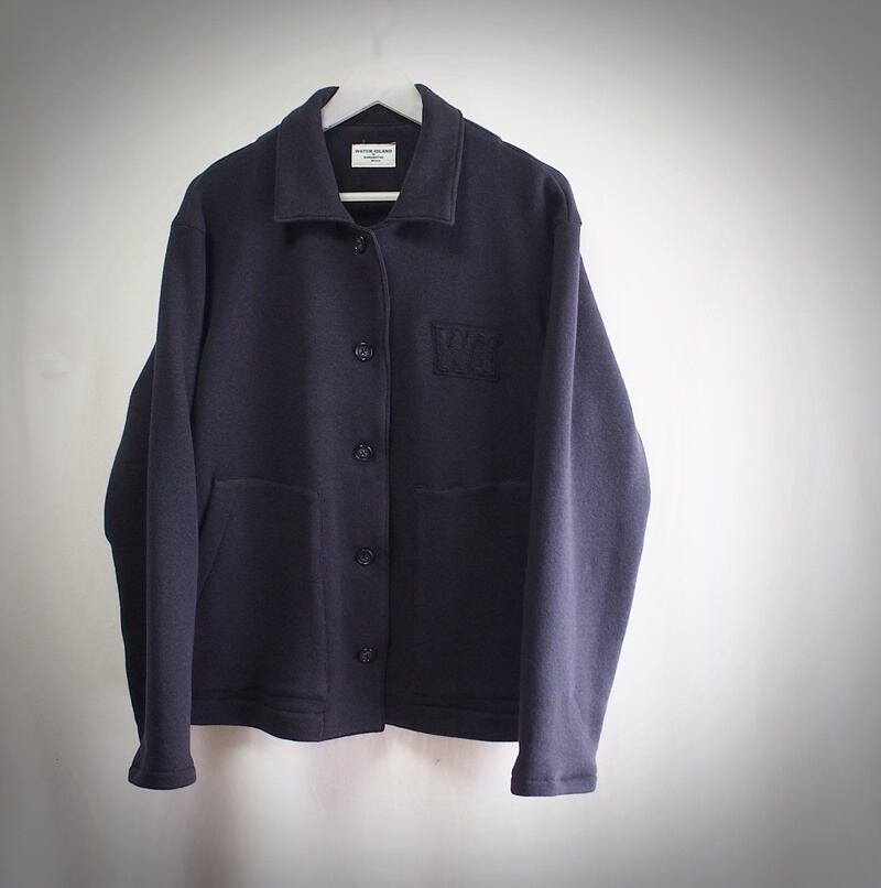 左胸に表地と同色で小さいワッペンのようなWIロゴアップリケ、裏使いにしたムラ糸裏毛とストレッチツイルを裁ち切りのままWIロゴにカット、生地端がほつれないよう二重ミシンステッチ