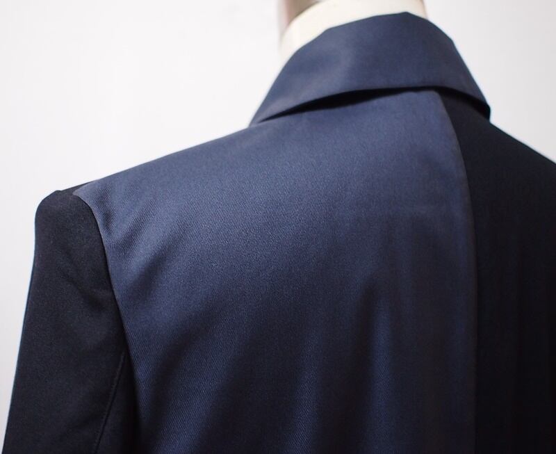 ブルーグレー×ダークネイビー、左右側面が違う印象になるバイカラーのクレイジーパターン、衿の表はストレッチツイル、裏にはストレッチキャンバスを配色したバルカラーコート