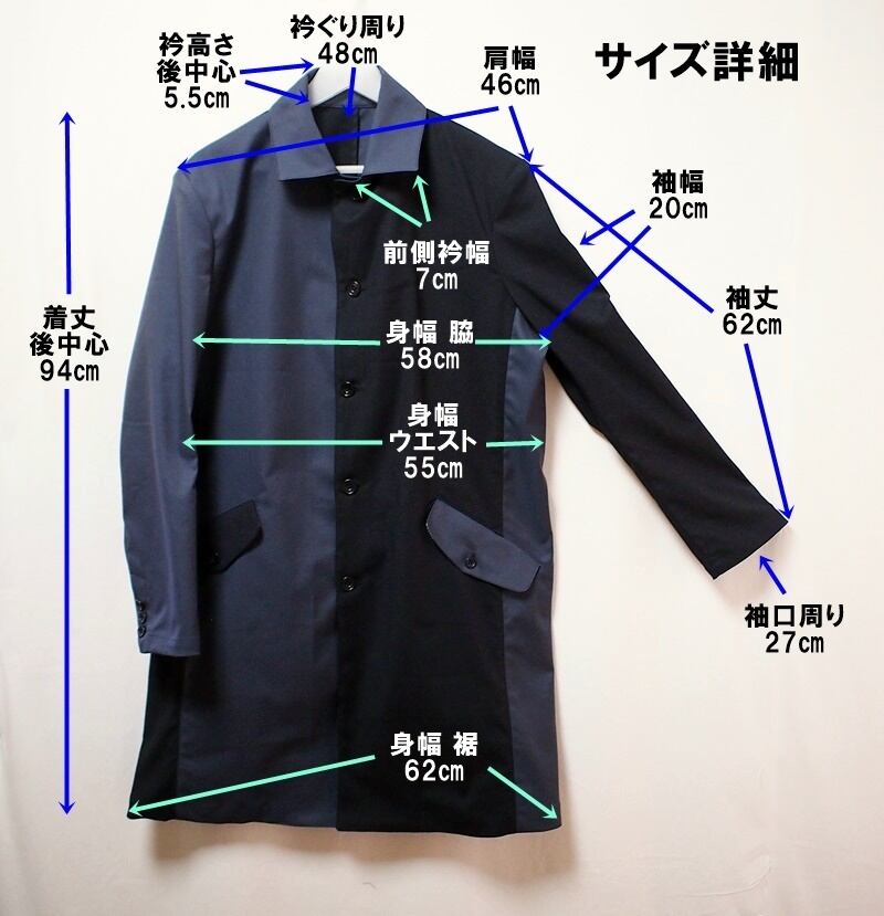 着丈94㎝、肩幅46㎝、袖丈62㎝、身幅は脇で58㎝、ウエスト55㎝、裾62㎝、スッキリコンパクトなLくらいのサイズ感