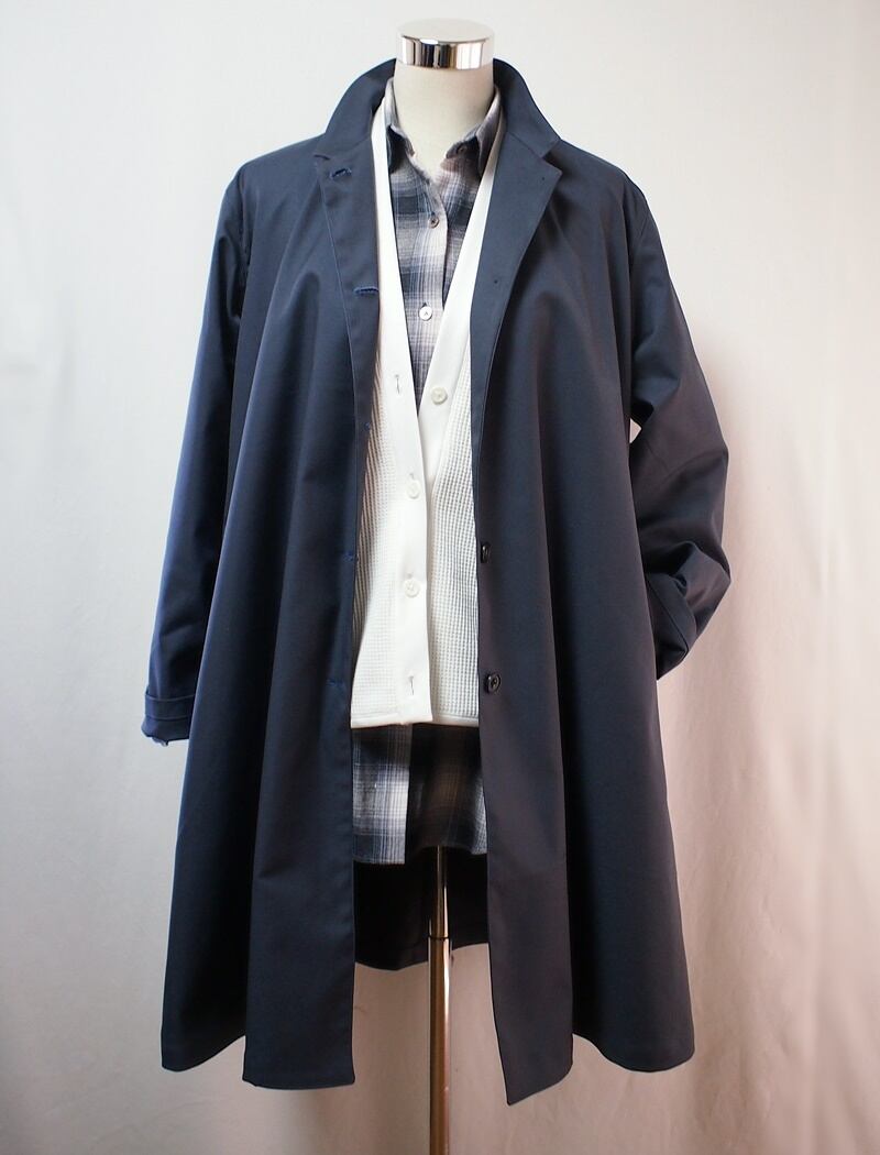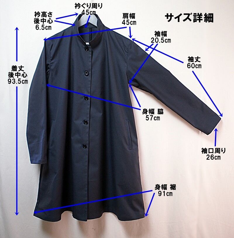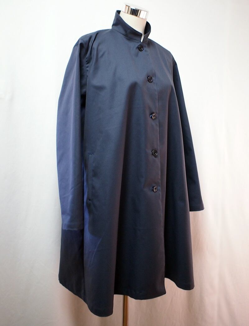 前中心5つボタン開き、後中心で衿の高さが6.5㎝、前側に向かって狭くカーブするスタンドカラーのAラインフレアーコート、ボタンは黒いスコッチ釦(直径20㎜)を使用