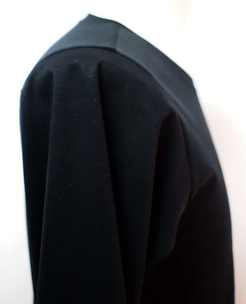 綿100%の60/-スーピマコットンを32Gのハイゲージで編み上げたポンチ素材を使用、しっかりとしたハリある質感のジャージー、美しい目面で上品で控えめに光沢ある色合いブラック