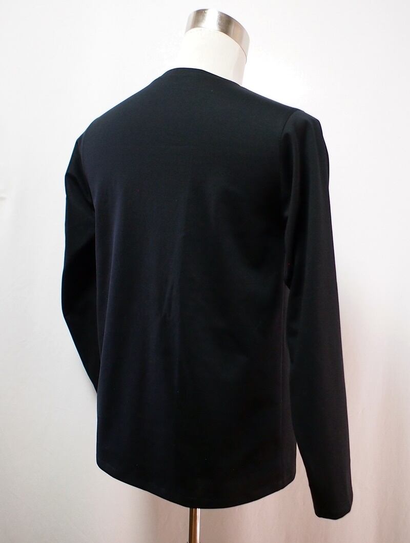 真っ黒なジャージーで左胸にWIロゴアップリケ付けたクルーネックのロングスリーブTシャツ